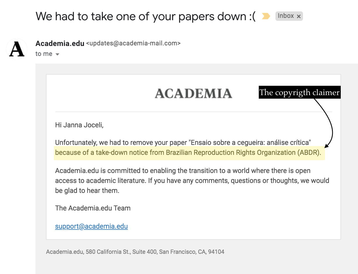 Academia has received a take-down notice from the Brazilian Reproduction Rights Organisation Associação Brasileira de Direitos Reprográficos (ABDR). This organisation was the submitter of the copyright claim. On 16 April 2020, after receiving the notification from Academia, I replied to the platform making clear I was the author of the essay “Ensaio sobre a Cegueira: análise crítica”. The removal of it was certainly unfair and authoritative, especially considering that the essay was there for a long time.