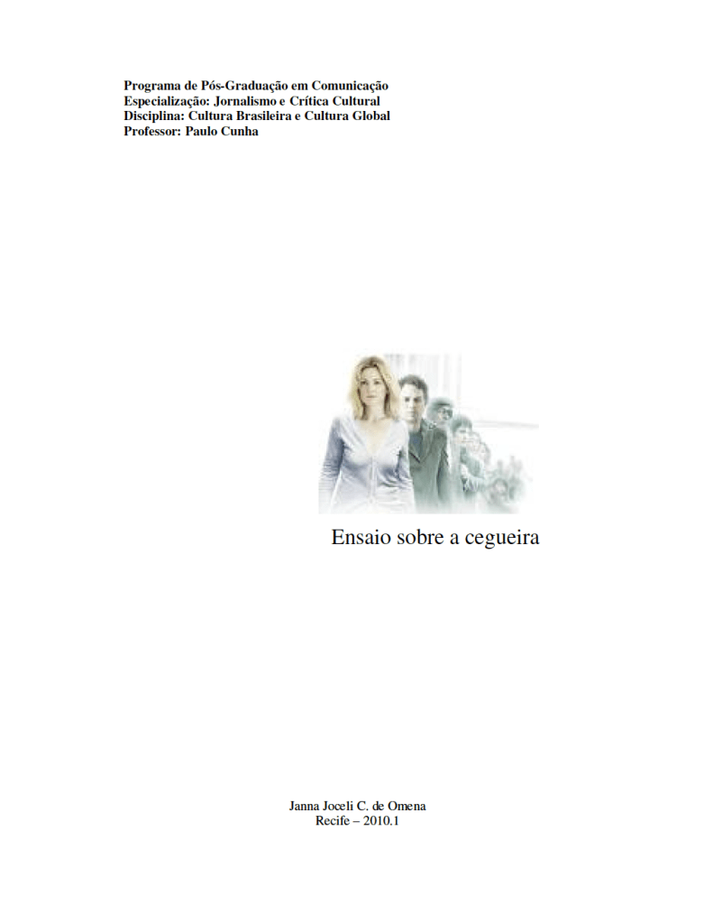 The essay “Ensaio sobre a Cegueira: análise crítica” was written by myself in early 2010 as part of a course that I attended at Federal University of Pernambuco in Brazil (long time ago, I know!). The course, named Journalism and Cultural Critique, was not only an incredible personal experience but also a confirmation that I wanted to be a scholar (yep, it also took some time, still on my way to get there). I am providing some ‘personal’ details in order to situate what this essay means beyond its written content.