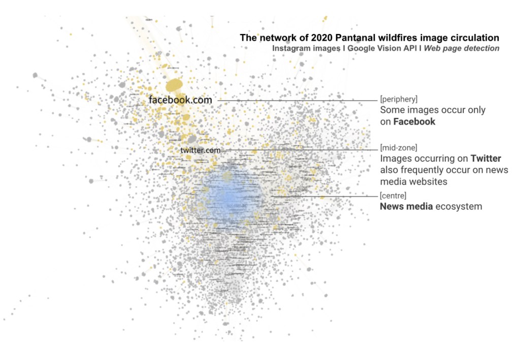 In the context of a SMART Data Sprint project, namely Investigating cross-platform visual issuefication: the case of Brazil’s Pantanal wildfires, coordinated by Carlos d’Andréa and André Mintz and developed by a team constituted by seven researchers (namely Débora Salles, Fabio Gouveia, Federica Laurencio, Jahnnabi Das Leonardo Melgaço and Priscila Yoshihara) including myself, I had the opportunity to explore and analyse a computer vision network of image circulation concerning the Pantanal fires in Brazil (other exploratory studies about this type of network can be found here or here).