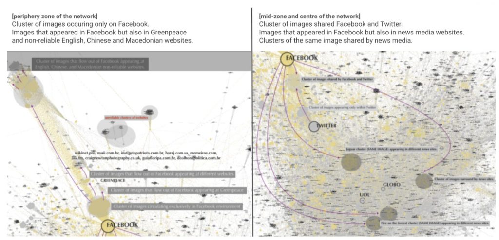 Computer vision network of 2020 Pantanal wildfires: analyses of images and sites of occurrence. 12.244 nodes: 7.566 top-level domains and 4.678 images. Above is an overview of the whole network, while the images below zooming in on the periphery zone (left) and mid and central zones (right) of the network. Image source: https://smart.inovamedialab.org/2021-platformisation/project-reports/investigating-cross-platform/