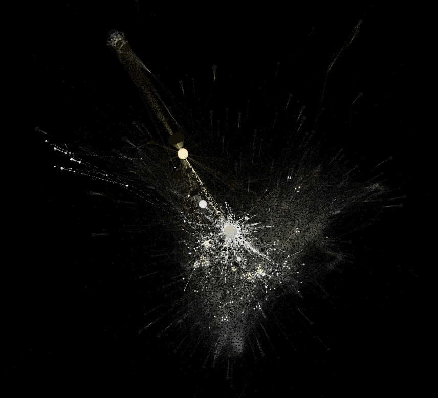 That said, it is crucial to understand how connections are made. In other words, what makes the nodes of a network bigger or smaller, e.g. occurrences of hashtags, comments, recommendations, likes, retweets, shares. In the case of the network of 2020 Pantanal wildfires image circulation, what makes on type of nodes bigger (webpages) is the number of times full matching images (the other node type) appear in a page. Who gives me this information is the module web detection of the Google Cloud Vision API. So, in the network visualisation below, the biggest node is Facebook which is just as important as the nodes located in the centre of the network and highlighted in blue. Facebook holds the majority of image appearance, while the centre of the network shows webpages (in this case, news media websites) capable of gathering a more diverse range of images. In this understanding, I relied on Gephi affordances to visually detect the neighbors of Facebook within this network, highlighting in yellow all images that appeared on this platform. This decision guided the interpretation of the network. The question of whether images sticks and flows out of platforms is also visually informed (read the legend of the three network visualisation below with the black background).