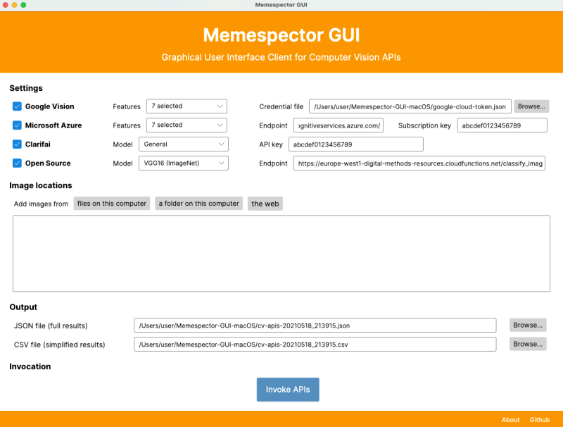 Memespector Graphical User Interface (GUI): research software that supports multiple computer vision APIs developed by Jason Chao.