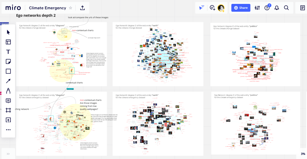 Last week I received Warren Pearce (University of Sheffield, UK) and Carlo De Gaetano (University of Amsterdam, The Netherlands) to sprinting with web entities-“climate emergency” & “climate change” images networks. We asked what are the web entities good for? what’s beyond the image?, knowing in advance that web entities (a person, a place/location or a thing) are textual descriptions to images based on web content. Considering the level of specificity afforded by Google’s web entities, the recommended approach to benefit from a network of web entities and images is the exploration of ego networks. This was what we did.