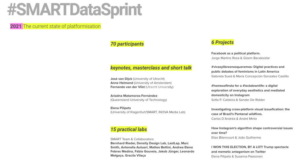 This year the SMART Data Sprint adopted the online mode due to the pandemic, it was a challenge to everyone! The theme was The current state of platformisation which counted with incredible keynote speakers who delivered excellent talks. They are the distinguished professor José van Dijck, the incredibles Anne Helmond and Ariadna Matamoros-Fernández and the amazing Fernando van der Vlist. What a team! Don´t forget to mention a short talk addressed by Elena Pilipets (SMART member) and a long list of collaborators leading practical labs prepared for attending the needs of researchers who were more or less familiarised with the digital methods approach, while other collaborators pitched and led projects. All videos are available here: https://www.youtube.com/watch?v=RjJcf_ihlKo&list=PLcGiWiKtsR0-GWexTZ2_vh9ttPC7zBElu