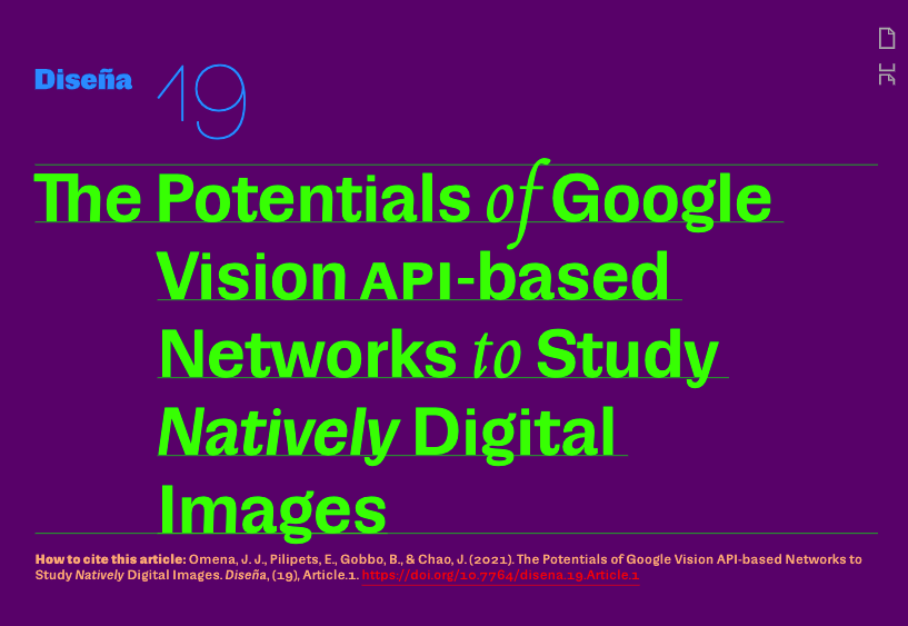 I´m super proud to announce a new paper about The potentials of Google Vision API-based networks to study natively digital images (see the English and Spanish versions), and written in collaboration with Beatrice Gobbo, Elena Pilipets and Jason Chao. This article is part of Journal Diseña special issue on “Visual Methods for Online Images: Collection, Circulation, and Machine Co-Creation” edited by Gabriele Colombo and Sabine Niederer, with editorial by Renato Bernasconi. Check all the articles here.
